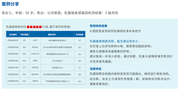 愛身譜®乳腺癌易感基因檢測通過檢測受檢者與乳腺癌相關(guān)的易感基因,精準評估疾病發(fā)生風險,在疾病發(fā)生之前有針對性的預防,改善自身的生活環(huán)境和生活習慣,從而有效降低或避免乳腺癌的發(fā)生。