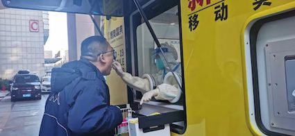 4日上午,來自全國的參會代表陸續(xù)抵達(dá)會場報(bào)到,會場外停放的全集成新冠病毒核酸檢測移動實(shí)驗(yàn)室共配備兩條人工采樣窗口和一條智能機(jī)器人采樣窗口同時進(jìn)行采樣。
