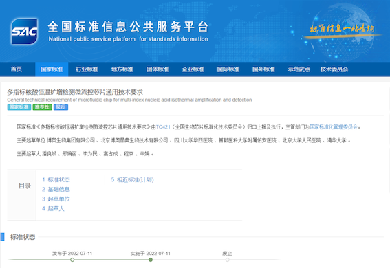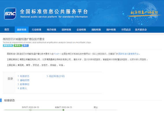 近日,國家市場監(jiān)督管理總局、國家標(biāo)準(zhǔn)化管理委員會(huì)發(fā)布《中華人民共和國國家標(biāo)準(zhǔn)公告》2022年第6號和第8號,由博奧生物集團(tuán)有限公司主導(dǎo)制定的國家標(biāo)準(zhǔn)《微流控芯片核酸恒溫?cái)U(kuò)增儀技術(shù)要求》(GB/T 41407-2022),《多指標(biāo)核酸恒溫?cái)U(kuò)增檢測微流控芯片通用技術(shù)要求》(GB/T 41521-2022)獲準(zhǔn)頒布,分別于2022年4月15日、2022年7月11日起正式實(shí)施。兩項(xiàng)新標(biāo)準(zhǔn)的頒布完善了我國核酸擴(kuò)增檢測技術(shù)領(lǐng)域的標(biāo)準(zhǔn)內(nèi)容,使相關(guān)技術(shù)所涉及產(chǎn)品應(yīng)用與服務(wù)更加規(guī)范、具有較強(qiáng)的指導(dǎo)性。