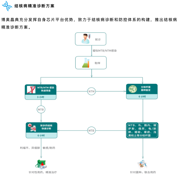 結(jié)核病精準(zhǔn)診斷方案中包含:分枝桿菌核酸檢測試劑盒(PCR-熒光探針法)、分枝桿菌菌種鑒定試劑盒(DNA微陣列芯片法)、結(jié)核分枝桿菌耐藥基因檢測試劑盒(DNA微陣列芯片法)。這三款診斷產(chǎn)品,環(huán)環(huán)相扣,涵蓋了結(jié)核快速篩查、菌種鑒定、耐多藥結(jié)核病快速診斷,構(gòu)成了晶芯®結(jié)核病快速分子診斷系統(tǒng)。結(jié)核診斷、輔助用藥全面覆蓋,真正實(shí)現(xiàn)結(jié)核全程分子監(jiān)控。