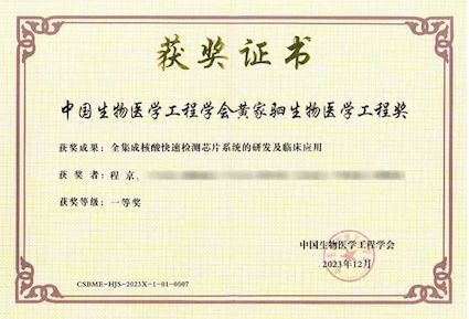 在程京院士帶領(lǐng)和國家重點研發(fā)計劃支持下,“全集成核酸快速檢測芯片系統(tǒng)的研發(fā)及臨床應(yīng)用”項目突破了一系列關(guān)鍵技術(shù)難題,首創(chuàng)了全集成核酸快速檢測芯片系統(tǒng)。成果達到“國內(nèi)首創(chuàng)、國際領(lǐng)先”,儀器和芯片試劑盒于2021年通過國家藥監(jiān)局應(yīng)急審批獲Ⅲ類醫(yī)療器械證書,通過歐盟CE認(rèn)證。項目成果被評為“2021年中國醫(yī)藥生物技術(shù)十大進展”,并被納入《北京市首臺(套)重大技術(shù)裝備目錄(2021年)》,榮獲CAETS(國際工程院理事會)頒發(fā)的首屆唯一一項“2021 CAETS傳播獎-工程成就獎”。