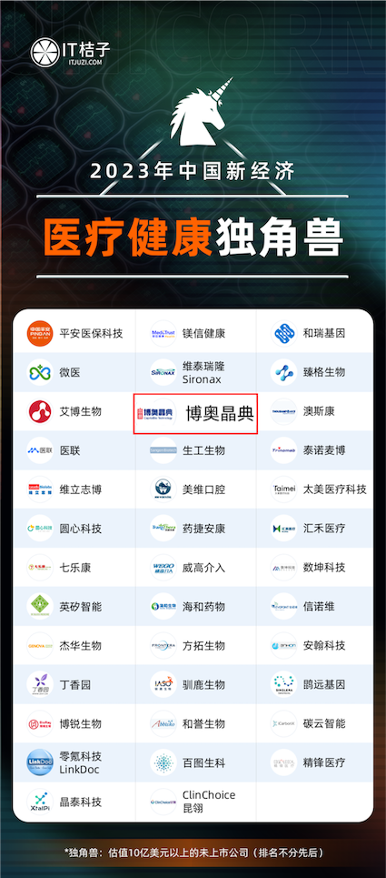 1月18日,新經(jīng)濟(jì)創(chuàng)投數(shù)據(jù)服務(wù)商 IT 桔子正式發(fā)布《2023年中國新經(jīng)濟(jì)獨(dú)角獸企業(yè)》系列重磅榜單。博奧晶典憑借在醫(yī)療健康領(lǐng)域的持續(xù)深耕及領(lǐng)先行業(yè)的卓越創(chuàng)新能力,榮登2023年中國新經(jīng)濟(jì)榜單,再獲行業(yè)權(quán)威認(rèn)可。