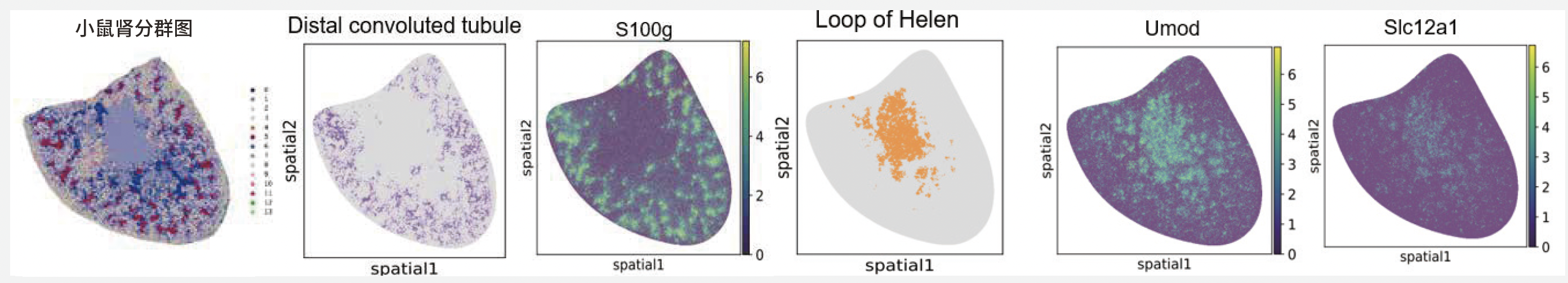 使用博奧晶典高分辨率空間轉(zhuǎn)錄組平臺(tái), 構(gòu)建了小鼠腎的高分辨率空間轉(zhuǎn)錄組圖譜,揭示了腎組織空間分區(qū)結(jié)構(gòu)(圖3)。其次,小鼠腎基因表達(dá)圖譜與HE 染色結(jié)果相結(jié)合可以清晰的了解各細(xì)胞類群的基因表達(dá)及相互作用,揭示它們對(duì)疾病發(fā)生、發(fā)展、治療、預(yù)后評(píng)估的價(jià)值。