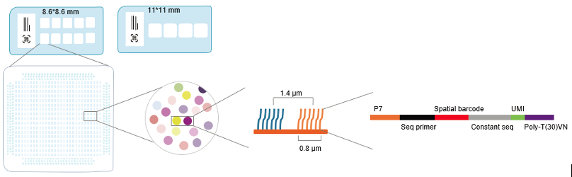芯片包括兩種類型:組織透化芯片和基因表達(dá)芯片,表達(dá)芯片捕獲區(qū)域面積為11*11mm。在捕獲區(qū)域內(nèi)存在著數(shù)千萬的探針簇,每個(gè)探針簇的直徑為0.8 μm,每平方微米有約18000 條探針,用于捕獲轉(zhuǎn)錄本(圖1)。每條探針捕獲序列由5 部分組成 :