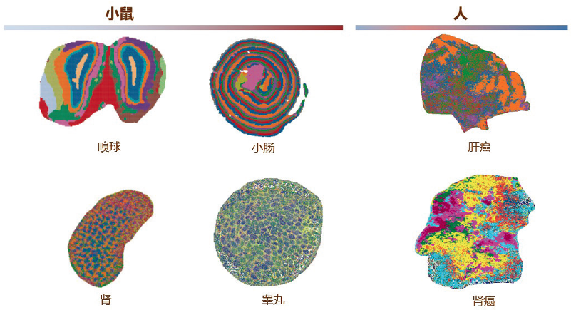 目前對(duì)人和小鼠的多種組織,包括嗅球、小腸、腎臟、肝等進(jìn)行空間轉(zhuǎn)錄實(shí)驗(yàn),繪制各種細(xì)胞類型在組織中的精細(xì)空間分布(圖4)。
