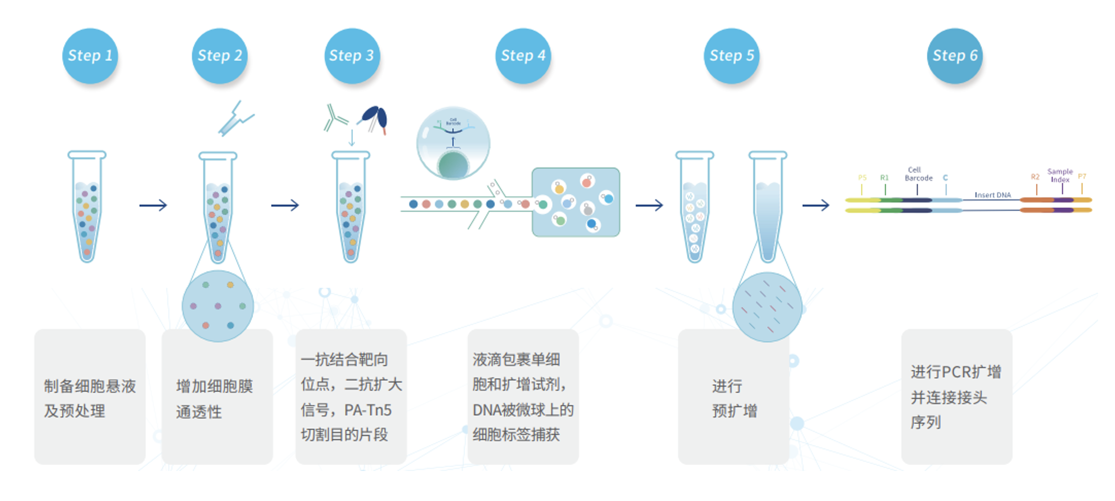 本試劑盒通過抗體和 Tn5 酶識別蛋白與 DNA 的結(jié)合位點(diǎn),并靶向切割 DNA 分子?;谝旱挝⒘骺丶夹g(shù)將經(jīng)過處理的單個細(xì)胞包裹形成油包水結(jié)構(gòu),并借助帶有細(xì)胞標(biāo)簽的微球捕獲 DNà 片段和標(biāo)記 DNA 分子,實(shí)現(xiàn)蛋白與 DNA 位點(diǎn)結(jié)合的測序,具有高通量、超高分辨率、超強(qiáng)特異性的特點(diǎn)。目前提供的檢測抗體:可選5種組蛋白修飾:H3K27ac、H3K4me1、H3K4me3、H3K27me3、H3K36me3;1種DNA結(jié)合蛋白:Rpb1(RNA聚合酶 Ⅱ)