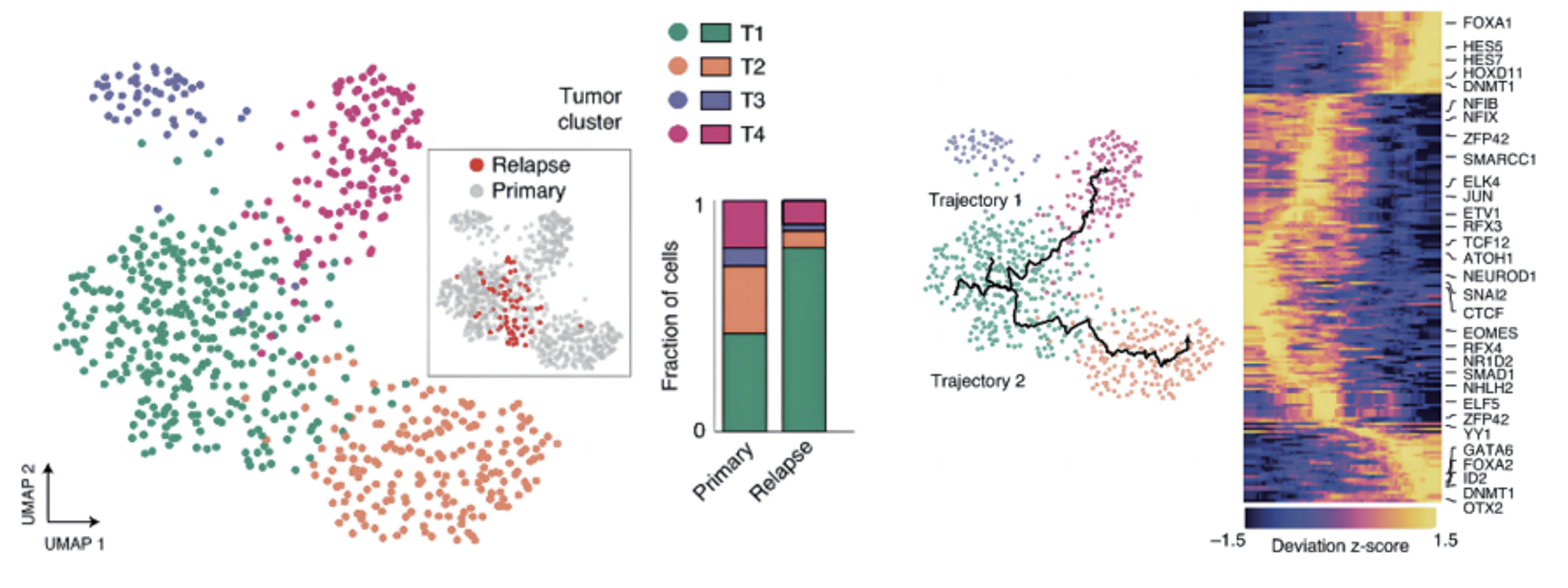 數(shù)據(jù)表明樣本共分為4類細(xì)胞亞群,其中復(fù)發(fā)腫瘤細(xì)胞T1亞群占比最高,該群細(xì)胞H3K27me3的信號弱并且細(xì)胞干性相關(guān)的基因活躍,具有向其他細(xì)胞類群發(fā)育的潛力。