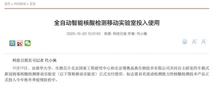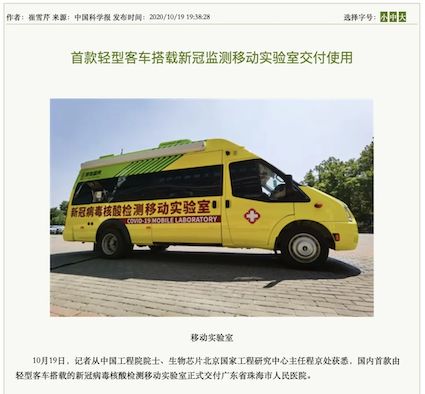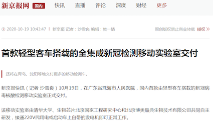 10月19日,“珠海市核酸檢測(cè)基地”在廣東省珠海市人民醫(yī)院正式揭牌啟用。揭牌儀式上,由清華大學(xué)、生物芯片北京國家工程研究中心和北京博奧晶典生物技術(shù)有限公司共同自主研發(fā)的首款輕型客車搭載的全集成新冠檢測(cè)移動(dòng)實(shí)驗(yàn)室正式亮相。
