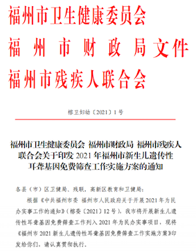 福州市新生兒耳聾基因篩查項(xiàng)目將在5月1日于指定采血機(jī)構(gòu)全面展開,篩查對(duì)象為在福州市指定采血機(jī)構(gòu)出生的常住人口新生兒(篩查對(duì)象需提供父母一方的身份證、戶口簿或居住證復(fù)印件),采用耳聾基因芯片檢測技術(shù),對(duì)新生兒四個(gè)常見耳聾基因的15 個(gè)突變位點(diǎn)進(jìn)行檢測。聯(lián)合物理聽力篩查,準(zhǔn)確做出耳聾病因分析,提出早期干預(yù)措施,減少聽力疾病兒童的發(fā)生率,真正實(shí)現(xiàn)“早發(fā)現(xiàn)、早診斷、早干預(yù)”,達(dá)到有效預(yù)防出生缺陷的目標(biāo),減輕家庭和社會(huì)負(fù)擔(dān),促進(jìn)社會(huì)和諧發(fā)展。